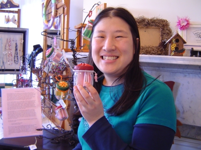 Made from recycled baby food jars, polymer clay and beads, hummingbirds are attracted to their bright colors. Individuals, like Tina, select the vibrant polymer clay colors, then roll and cut the clay to form flower shapes for the top of the jar. Once the clay is baked, a hole is drilled into the top of the lid to provide the hummingbirds with access to the delicious nectar. A recipe for the nectar is included inside each feeder. Coordinating beads are placed on wire to create a decorative hanger.