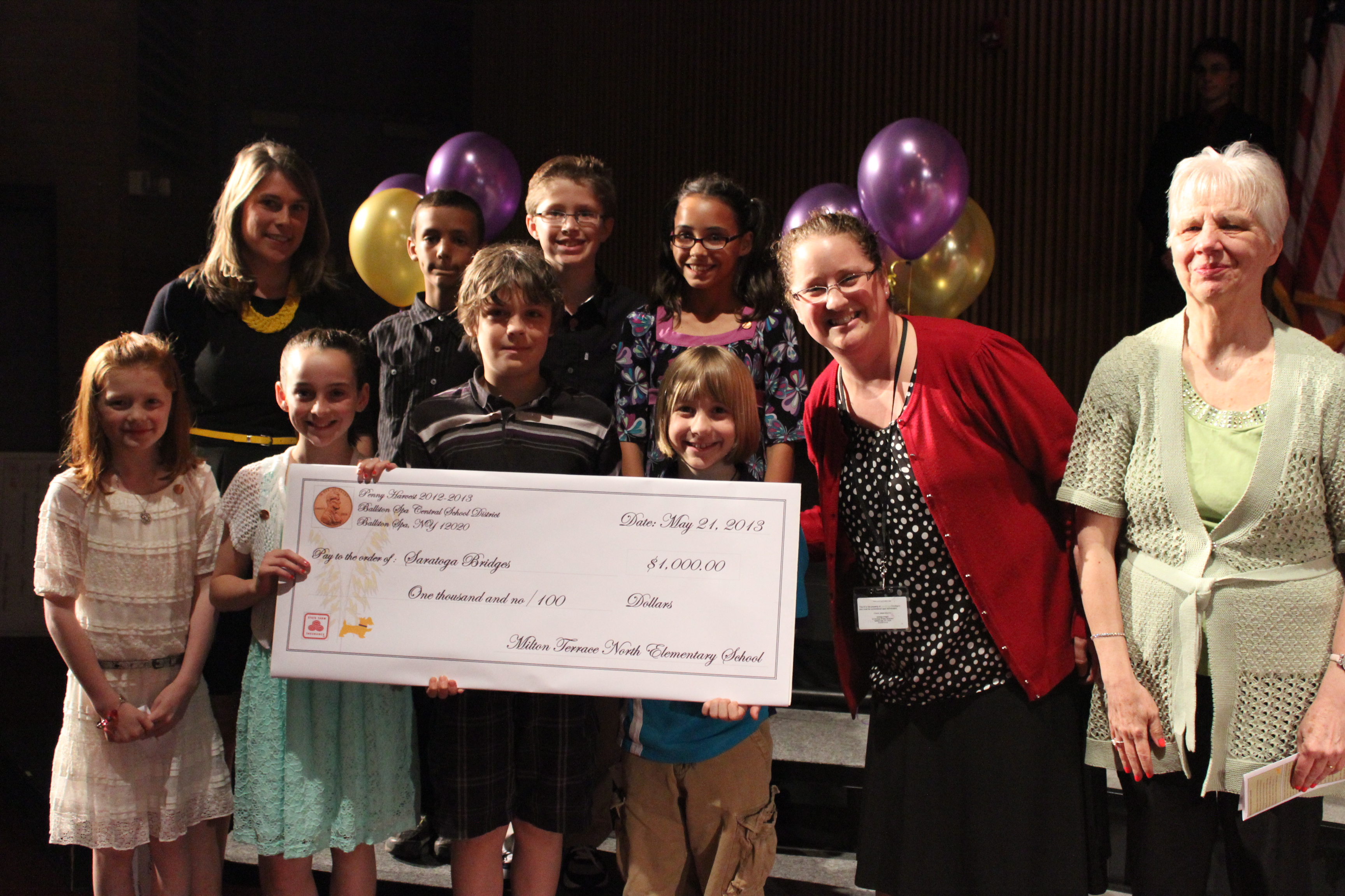 Saratoga Bridges was among 15 local organizations chosen to receive a donation from Ballston Spa Elementary, Middle and High Schools’ Penny Harvest project on Tuesday, May 21. (Please read the article in The Saratogian that lists all of the organization.) The Ballston Spa School District and State Farm Insurance hosted a reception and check presentation to announce that the students raised $9,360 for charity. The Penny Harvest roundtable group at Milton Terrace North selected Saratoga Bridges who obtained $1,000 from their efforts.