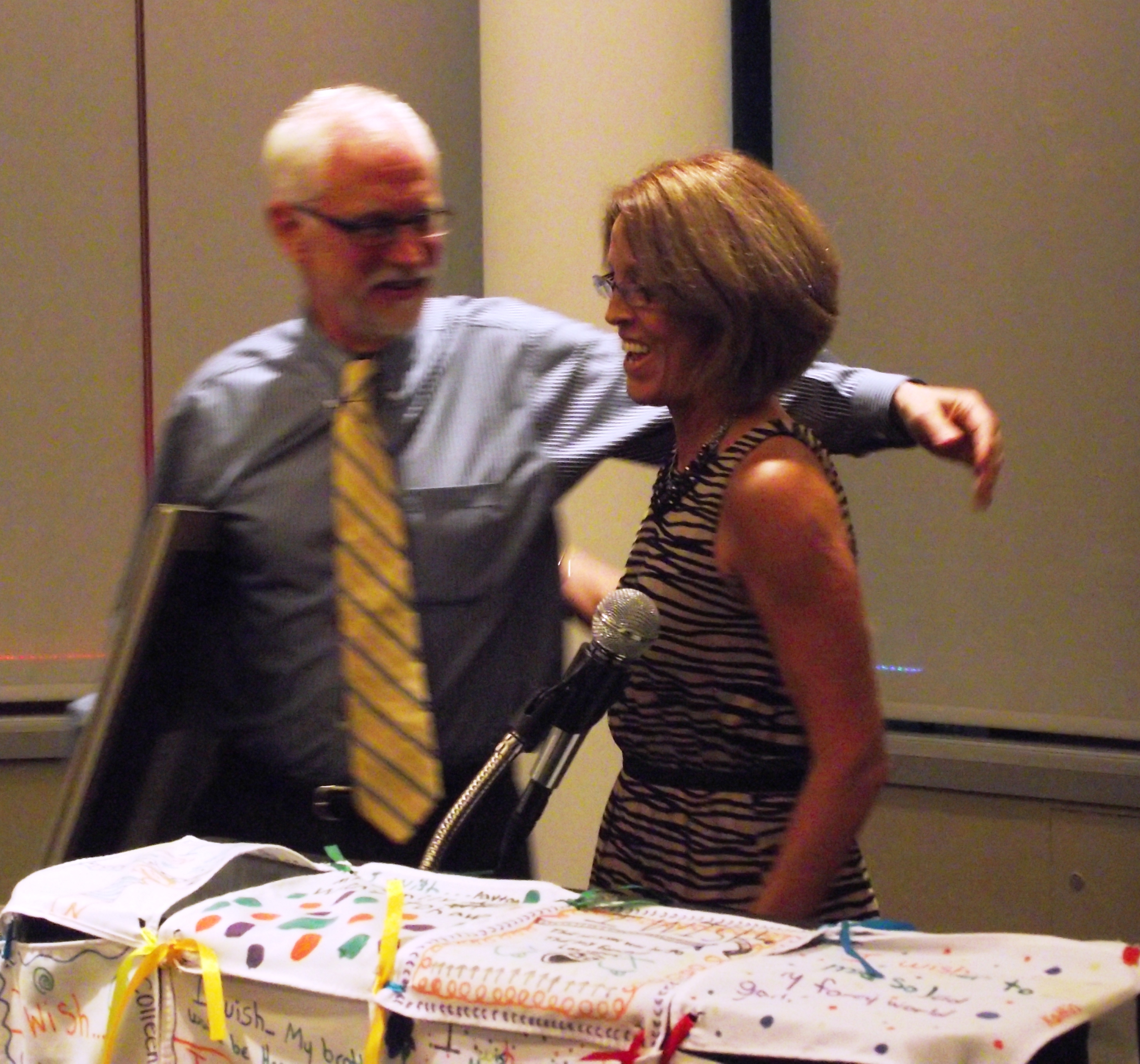 Patty Paduano, Family Support Services Director, presented Don with a torn cardboard piece created by our artists from Creative Endeavors.