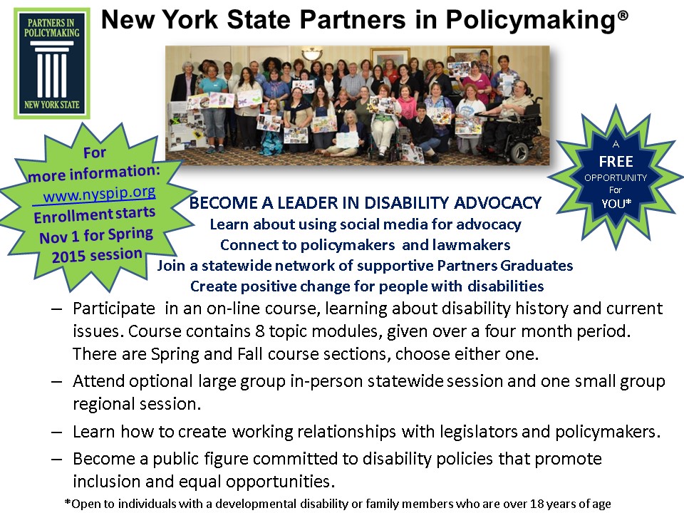 Cornell University’s Industrial and Labor Relations Disability Institute is working on a project called Partners in Policymaking. It is an innovative national model of leadership training for people with developmental disabilities and their family members. This free program provides knowledge about issues and policies related to disability, and how to influence policy development on a local and national level. Their goal is to create a productive partnership between people with developmental disabilities, their family members, and policymakers.