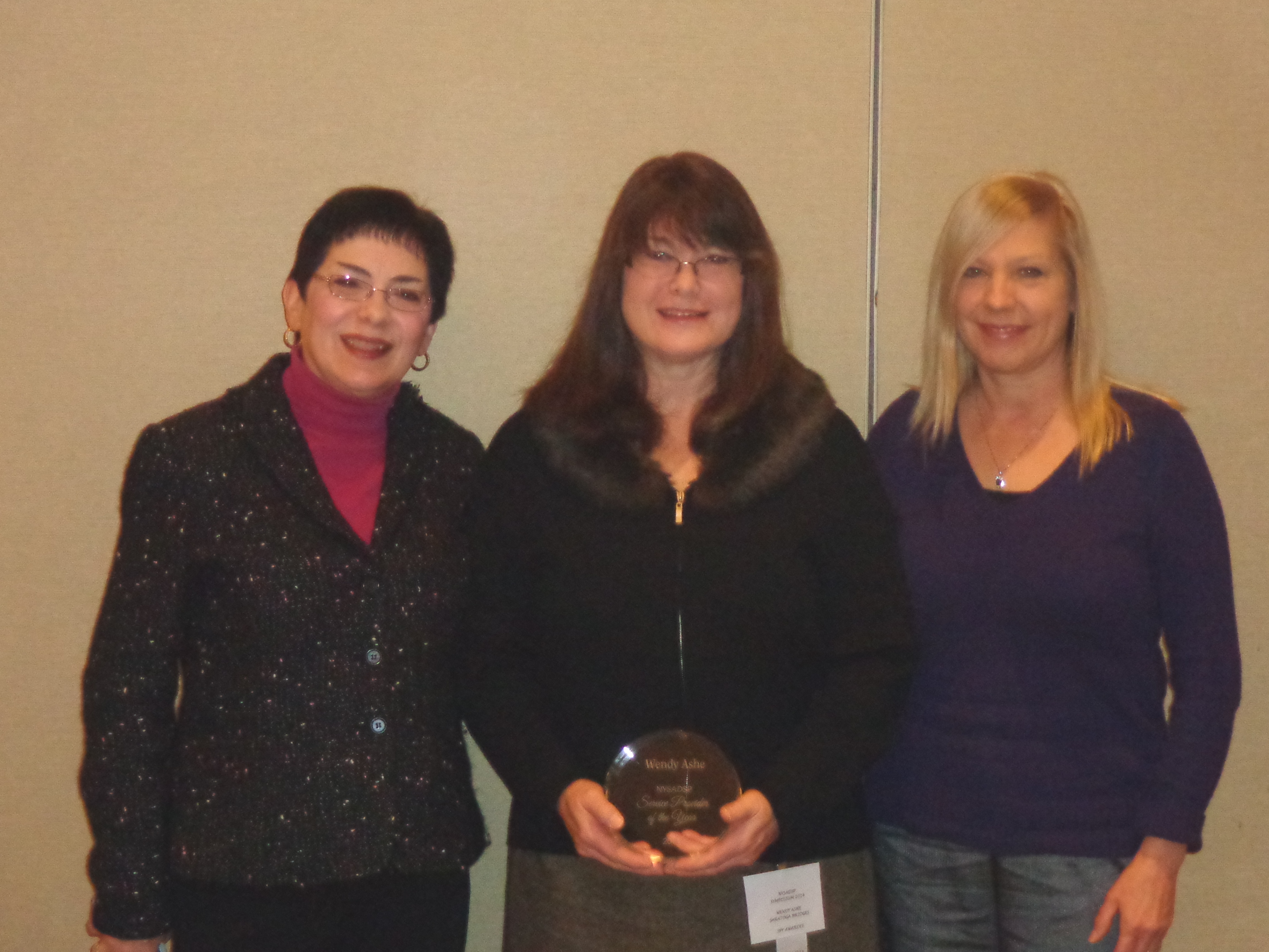 We are thrilled to announce that Wendy Ashe, one of our Certified Occupational Therapy Assistants (COTA), was honored with a Leadership Award from New York State Association of Day Service Providers (NYSADSP) on Thursday, November 6 at the Gideon Putnam Hotel in Saratoga Springs!  One of 6 from across the state, Wendy was the winner chosen from the Central East Region.  This award recognizes Direct Support Professionals who provide strong and consistent leadership for direct support staff and exemplifies many of Wendy’s best qualities — initiative, passion, compassion, commitment, self-management, teamwork, intelligence, integrity, promotes independence, role model, professional, creative and innovative.
