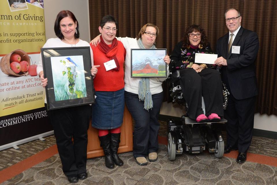 Scott Perkins, an Adirondack Trust Company Community Fund Advisory Committee Member, presented a generous check of $2,000 to Pamela Polacsek at the awards reception she attended with (pictured left to right) Amanda, Debra Brennan and Shannon. The funds will be used to support professional artists, supplies and materials for “Breaking Down Boundaries Through Art” – a free program for artists like Amanda and Shannon held at Creative Endeavors.