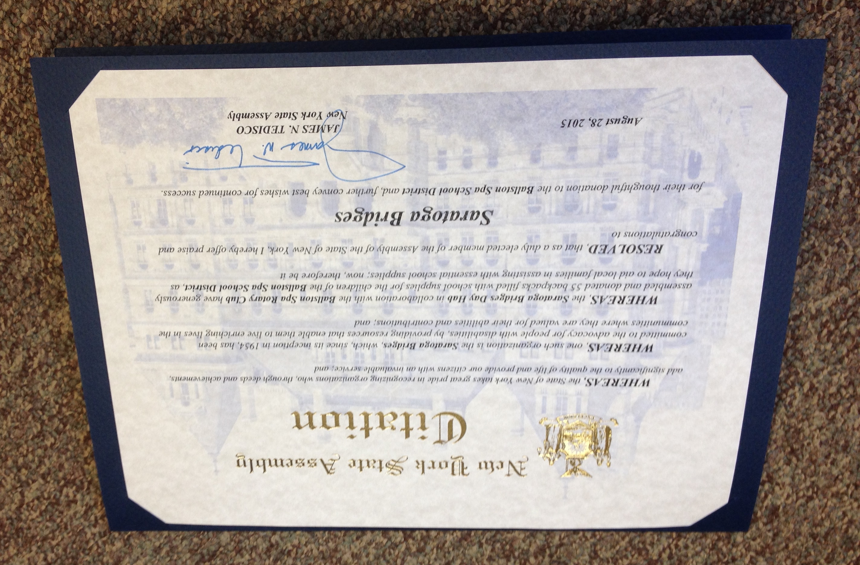 In its second year, the Rotary Club buys the backpacks and supplies and we are proud to help stuff them. We love to participate in local volunteer endeavors and thank Assemblyman Tedisco for the Proclamation he presented to us. It recognizes our commitment to making our community a better place to live, work, volunteer and grow up!