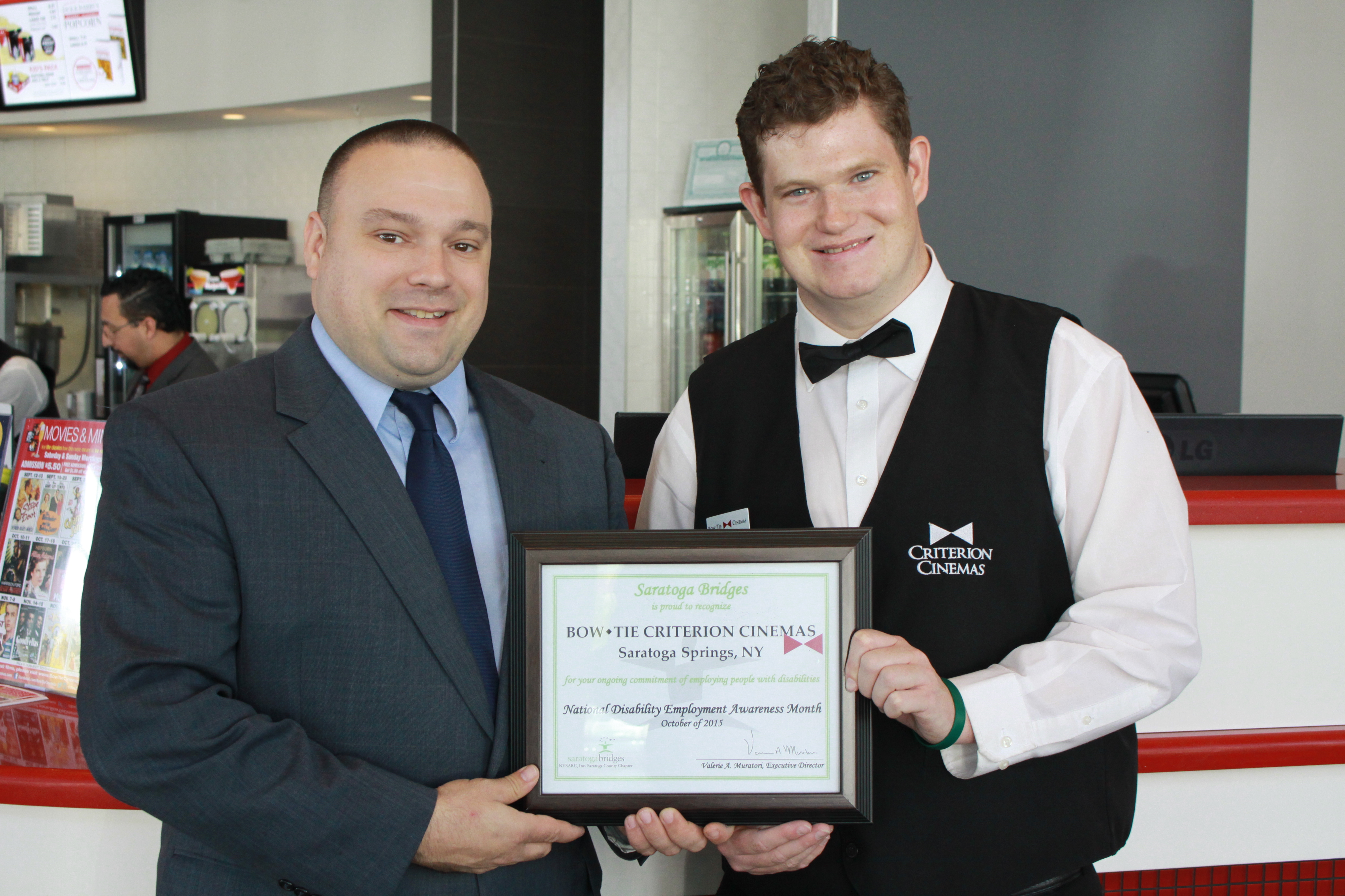 As National Disability Employment Awareness Month (NDEAM) during October concludes, Saratoga Bridges also wants to recognize Bow Tie Criterion Cinemas in Saratoga Springs as another business that understand and embraces the benefits of hiring and training people with disabilities.  Adam Moak (right) presented their General Manager Ethan Ochis with a framed certificate for their commitment in supporting our individuals.