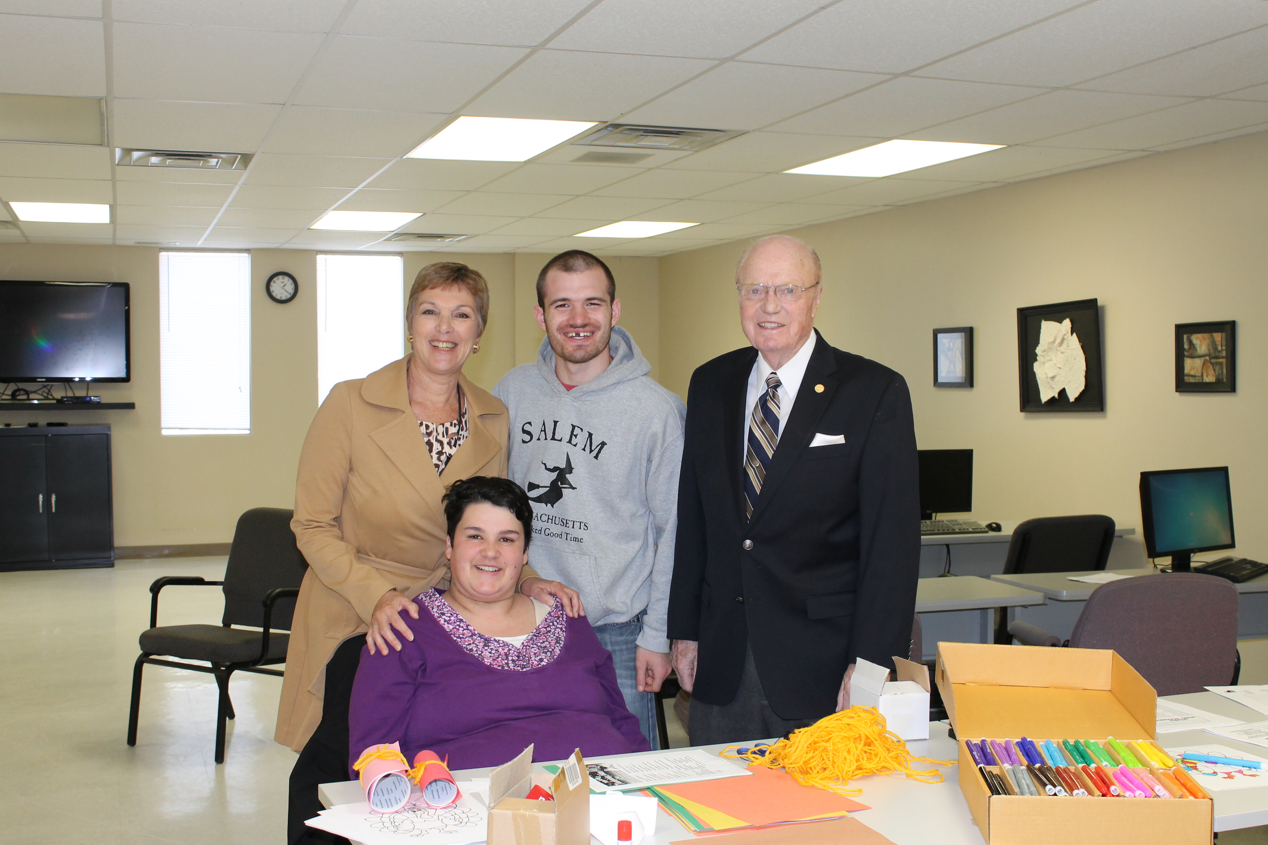 Senator Hugh Farley and Executive Director Valerie Muratori are with ACE (Achieving Career Enhancements) participants Christopher Walsh and Lynda Spaulding in the Alfred Z. Solomon Media & Computer Lab