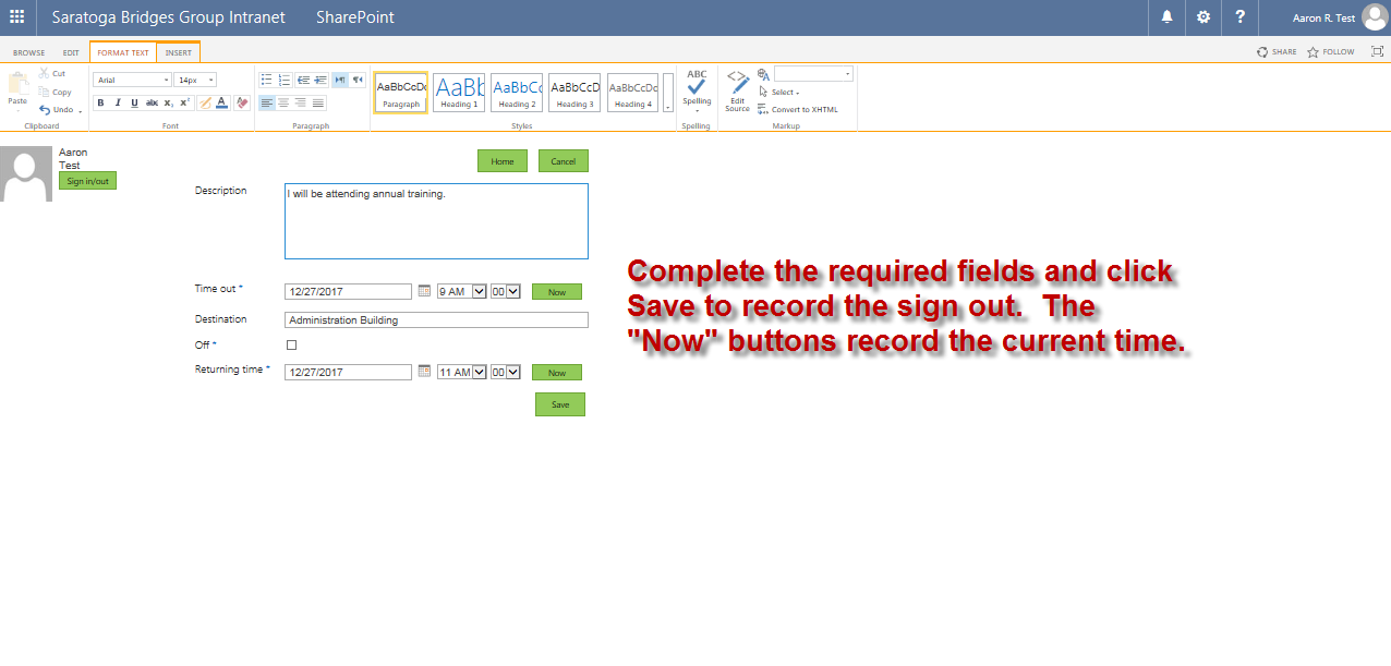 Next, either sign in by clicking the Now button, then Save, or adjust the drop downs for time, then click Save: